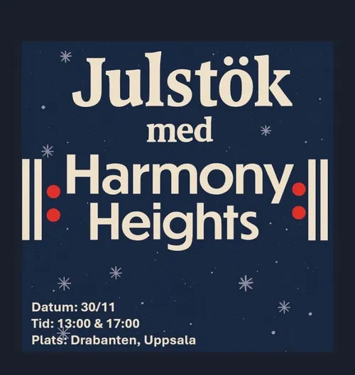 Harmony Heights Chorus är en show- och barbershopkör som är en given del av Uppsalas kulturliv sedan över 30 år. Vårt fokus är energi, musikalitet och underhållning. Harmony Heights är en showkör som sjunger 4-stämmig a cappella. På vår repertoar finns allt från barbershop till pop. Vill du uppleva vår energi på scen? Besök gärna vårt nästa event eller boka oss som underhållning till företagsevent eller privata tillställningar.